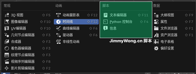 整个Blender的功能基本是围绕这个 图1-1展开的,【3D视图】就是整个的效果输出,是主窗口,其它所有内容,基本是为他服务的,就如我们所见的【常规】项【3D视图】以下都是编辑器,也就是编辑视图,最后也是结合到【3D视图显示】像【动画】【脚本】【数据】也是如此,我们使用时,可以根据需求去选择需要【区域】内容,也可以使用官方为我们提供的【布局】