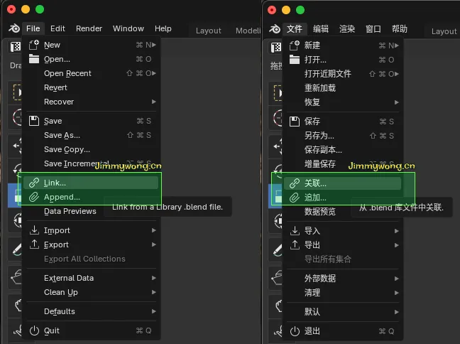因此在这里我们就需要用到【关链】或【追加】的功能。这两个功能主要用于【文件.blend】之间的串通。