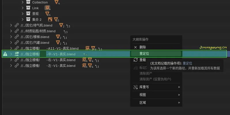 一般中型以上,或是较为复杂的场景,建议使用【关链】这个功能来引入【关键.blned】文件,这样,后期如果更改对应的【关键.blend】文件,在任何【关链】的【关键.blend】的地方也会随着变动,在合作项目上有极大的便利性。