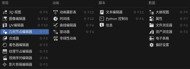在Blender中将整个应用划分为【常规】【动画】【脚本】【数据】这四大模块,而每一项内容又会随着对象的性质进行变化,比如在【数据】这一项里【修改器】【粒子】【物理】【约束】这些也是比较重要的内容,因为内容较为广,因此会分成成模块化进行讲解,这样的梳理,相对来说易于让读者了解各个模块的作用,Blender并不像FreeCAD那样,分成多个工作台,Blender的创作并不要求像FreeCAD那么严谨,毕竟Blender的创作艺术成本比较高,相对来说也比较随意,也可以产生很多不同的造型,,因此本书主要是针对,如果使用Blender去构造一个项目和管理项目