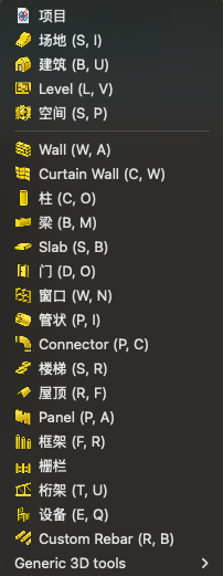 一,先设定一些通用数据,将相同的数据先创建相同高度厚度的寺体,我们点击【墙】就会弹出菜单。 图 2.3-1