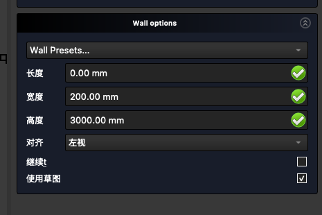 我们在这里可设定【墙】的一些默认参数,【长度】,【宽度】,【高度】,【对齐】方式,这个【对齐】方式主要有三个参数【左】【中】【右】就是墙体是基于线的哪一侧。而【长度】【宽度】【高度】这里并没能【FX】函数功能,就是说这个是无法去绑定数据集的内容的。图 2.3-2